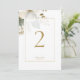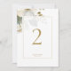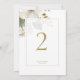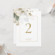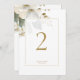 Chic e elegante. Este lindo número da mesa de casamento apresenta um adorável buquê floral de aquarela com sotaques de ouro de imitação. O design inclui uma fonte contemporânea em imitação de um conjunto de ouro dentro de uma camada branca macia com uma estrutura delicada. A design é repetida atrás.