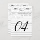 Esses cartões únicos de casamento da tabela de cartões de biblioteca são perfeitos para um evento de tema de casamento vintage ou livro. Personalize o texto personalizado "carimbado" com os nomes da noiva e do noivo (como Autor) e um título personalizado. Esquema de cores preto e branco. Nota, os envelopes podem ser omitidos para este produto. Para solicitar: personalize com seu texto personalizado e digite o primeiro número da tabela (01), escolha a quantidade de cartões necessária para esse número de tabela (dependendo do número de assentos nessa mesa) e adicione ao seu carrinho de compro. Repita esse processo para cada número de tabela necessário antes de fazer seu pedido.