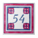 Uma mão desenhou quadros vermelhos e azuis ao redor de um número de casa azul com contornos azuis escuros em um fundo branco, e um padrão floral nos cantos.