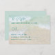 Cartões de resposta de casamento na praia com texto do número de convidados. Fundo de costa marítima com texto azul escuro. Este design faz parte da coleção de casamento By the Sea.