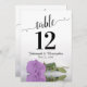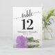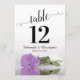 Estas belas cartas de números de mesa facilitarão aos seus convidados encontrar os seus lugares na sua recepção de casamento. Possui um design maravilhoso com caligrafia de script e um rosa lilás solteiro, cor púrpura, deitado do lado com ondas e reflexões de ondulação. Há espaço para os nomes dos casais e a data do casamento.