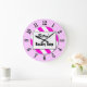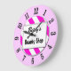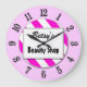 Um relógio de parede único lendo Compro Beauty em letras de bloco com espaço para o seu nome em um script retrô em um fundo listrado rosa e branco cercado por letras pretas em rosa.