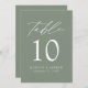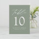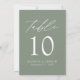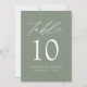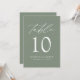 Trendy, cartões minimalistas de números das mesas de casamento com cartas brancas modernas com "Mesa" em um roteiro de caligrafia moderno. O design apresenta um fundo verde sábio ou uma cor de sua escolha. O design repete atrás. Para solicitar os cartões verdes de mesa: adicione seu nome, data de casamento e número da tabela. Adicione cada número ao carrinho individualmente e faça check-out quando terminar.