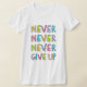 Camisas customizáveis com slogan inspirador - nunca, nunca, nunca dê acima - na tipografia colorida, estilo dos desenhos animados.
