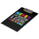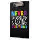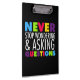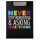 Uma grande prancheta para professores, profissionais educacionais, pais, e treinadores, esta prancheta preta de inspiração com vário texto brilhante da cor lê nunca a parada querendo saber & fazendo perguntas!