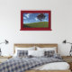 Uma paisagem 3D pacífica em primavera ou verão, criada em Vue. Em cima de uma colina coberta de grama verde e primatas coloridos, contra um céu azul com vísceras de nuvem, um mapa japonês vermelho solitário com uma bancada de madeira embaixo dela para parar e descansar. Uma águia solitária voa ao vento.
