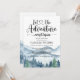Deixe a aventura continuar o convite para chás de fraldas de aquarelas com florestas e montanhas paisagem selvagem com tipografia de escrita de caligrafia com coração no meio.