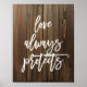 "O amor sempre protege" sobre um fundo de madeira falsa