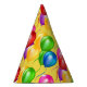 O chapéu do partido é mostrado em um design brilhantemente colorido bonito do impressão dos balões do aniversário.