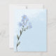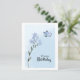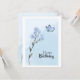 Um delicioso cartão de aniversário com uma delicada borboleta azul que voa entre um aglomerado de flores azuis vibrantes. O fundo é uma sombra calmante de azul. O cartão também apresenta a mensagem "Parabéns" em uma fonte preta e cursiva.