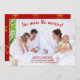 Todos em Um, Anúncio de Nascimento e Cartão de Férias com sua própria foto e mensagem personalizada. O texto diz: "Quanto mais o melhor!", em vermelho festivo, escrito por telefone. O modelo está pronto para você adicionar sua foto, saudação e uma nota quando o bebê estava nascer. Sua mensagem no fundo está em vermelho e preto, em uma camada branca para ajudá-la a se destacar. A parte de trás da carta está combinando com vermelho e com flocos de neve e corações dourados. Procure designs de alternativo na nossa loja.
