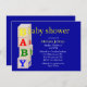 Convite moderno à moda do chá do bebé feito em azuis marinhos ricos.  Os gráficos dos blocos do bebê que soletram para fora o BEBÊ, em cores preliminares brilhantes, decoram o lado esquerdo do convite. Personalize todo o texto feito sob encomenda para serir suas necessidades do evento.