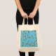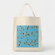 O design nesta sacola orgânica lindo do mantimento caracteriza alaranjado bonito e preto bumble abelhas em um fundo azul brilhante.
