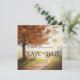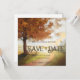 Salve a data. Caminho russo caminhando por um campo com árvores de queda. Design de aquarela com amarelo, ouro e laranja.