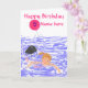 Cartão de aniversário customizável para o entusiasta nadador. Um para uma menina e outro disponível para um menino. Adicione o nome e a idade à parte dianteira, e toda a mensagem e imagem extra demasiado se for necessário, para dentro. Uma natação da menina e um leão de mar que guardaram um balão com a idade nela.