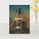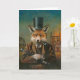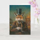 Este cartão é ilustrado com uma raposa de cavalheiro vitoriano esperta em frente a uma casa de mansão em chamas.
