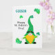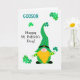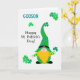 Um cartão de boas-vindas para seu afilhado na Rua. Dia de Patrick, com um duende giro, segurando um shamrock. O duende tem um chapéu muito alto, em um padrão verde, uma barba grande de gengibre, um nariz enorme, capas e meias listradas e calçados pretas. No topo, em letras verdes escuras, está a palavra "GODSON" e a mensagem dentro é fácil de personalizar ou apagar.