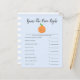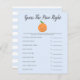 Cartão de chá de fraldas de tema bonito e bonito com ilustrações de uma fruta laranja sobre fundo azul. Os textos são editáveis. Um jogo perfeito para jogar durante o chá. Enumera o essencial do bebê e aos hóspedes para adivinhar o preço. Quem quer que adivinhe o preço mais próximo ganha!