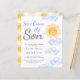 Convide a família e amigos para o seu chá de fraldas temático com este convite para chás de fraldas dos rapazes. Ele apresenta o texto "Aqui Vem o Filho" em tipografia azul na moda com uma cor d'água amarela e nuvens. O dorso é decorado com um padrão de sol sorridente. Facilmente personalizável. Original Watercolor © Michele Davies.