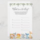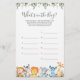 Os animais Safari têm o chá de fraldas de adivinhação que está no cartão de jogo apresenta uma ilustração de animais cártaros com aquarela e verde-aquarela eucalipto garland e uma elegante fonte de estilo manuscrito.