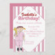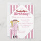 Uma menina pequena em um uniforme e em um boné de beisebol cor-de-rosa do basebol está com bastão e bola à disposição contra um fundo pinstriped neste convite de aniversário. Todo o texto pode facilmente ser personalizado para serir suas próprias necessidades. De minha imagem digital-criada original.