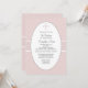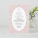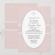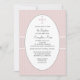 Um plano de fundo esbranquiçado, manchado com pequenos pontos brancos, apresenta um centro oval branco com uma cruz de pincel que mantém sua redação personalizada. O convite é cruzado por uma fita de textura larga, aparada em branco. Este é um convite encantador para qualquer ocasião religiosa.
