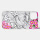 Desenho de caneta esferográfica preto-e-branco de um cavalo cortante com margaridas rosa. Ballpoint Caneta art de Robin D. Cox.