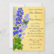 O design original das belas artes de uma traça espanhola verde elegante da lua no jardim azul do Delphinium floresce contra um fundo dourado pelo desenhista Carolyn McFann do estúdio de ronrom de dois gatos impresso em convites customizáveis do casamento.