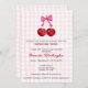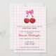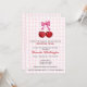 Celebre a doce chegada de filhinhas gêmeas com este adorável anúncio de chá de fraldas com tema cereja! Apresentando duas cerejas vermelhas brilhantes com um arco rosa, esse charmoso design simboliza o vínculo especial entre mãe e filhas. Comparado com tons de cheque cor-de-rosa suave e com um roteiro lúdico, é a maneira perfeita de convidar os entes queridos a chá da mãe a ser com amor e alegria. Doce, simples e cheio de diversão frutífera!