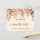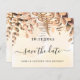 Uma cinta e moda Salve a placa Date para uma festa de aniversário 40th (ou qualquer idade). Um fundo de cor aquosa de ouro decorado com folhagem de eucalipto e samambaias de ouro. Personalize e adicione uma data, nome e texto. O texto: Salvar a Data é gravado com um script de estilo com letra de tendência grande.