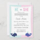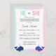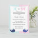 O género revela o convite do chá de fraldas com design da baleia e fundo azul e cor-de-rosa pastel.