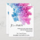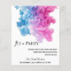 Um chá de fraldas orçamentário ou gênero revela convite. Num fundo branco, o design consiste em uma elegante fumaça azul e rosa, que contém o sobrenome do bebê dentro do texto da tipografia branca. Personalize adicionando seu evento de cheio e os detalhes de contato à frente e atrás.