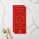 Estes menus feitos sob encomenda do casamento caracterizam um fundo vermelho profundo, régio com teste padrão floral da cor do ouro, um quadro decorativo para destacar os nomes dos noivos, e uma figura pequena Ganesha. Coordena com a escala inspirada verdadeiramente excepcionalmente indiana do casamento e dos artigos de papelaria.