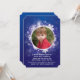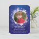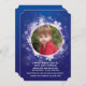 Uma safira, convite azul que caracteriza uma janela redonda da foto cercada por flocos de neve. Queira salvar o dinheiro? Imprima este cartão no papel do canto básico, quadrado.