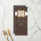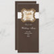 Brown, o amarelo, e o cartão alaranjado do menu do casamento do impressão do leopardo com acentos brancos e foto do papel marrom com 3D textured o olhar como um fundo impresso no Livro Branco liso. Um cartão temático do menu do casamento do safari africano corajoso do divertimento. Design pelos gráficos do © de Elke Clarke licenciados. Impressão animal.