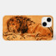 Um extinto leão-berbequim agachado, descansado, caneta e desenho de tinta do pintor holandês Rembrant Van Rijn no final dos anos 1640. Design clássico em cores amarelas cor-de-laranja-acastanhada vibrante e amarela.