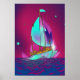 Um navio solitário navegando no oceano aberto, a arte nos mostra muito azul, roxo e um pouco rosa na coloração. Esta é uma arte gerada por IA.