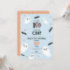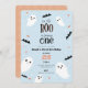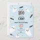 Nosso pequeno Boo está virando um! Primeiro convite de aniversário do Dia das Bruxas bonito para o seu dia especial. A design moderna apresenta um adorável fundo pastel azul macio com pequenos fantasmas, morcegos, folhas e ilustrações de abóbora. Personalize com suas informações. Perfeito para um pequeno aniversário.