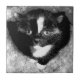 Este gatinho fofo entrou nos estábulos do meu marido e acabou ficando lá. Eu alterei digitalmente a imagem para parecer um retrato preto-e-branco de um gatinho de smoking, capturado num momento de curiosidade silenciosa. Os olhos grandes e reflexivos do gatinho olham com atenção, atraindo o foco em meio ao forte contraste entre sua pele escura e suas marcas brancas. As texturas suaves rodeiam o gatinho, melhorando a sensação de calor e solidão, enquanto a paleta monocromática adiciona uma camada de mistério artístico à composição.