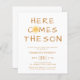 Convide a família e os amigos para o seu chá de fraldas temático com este convite para chás de fraldas de orçamento. Ele apresenta o texto "Aqui Vem O Filho" e um adorável sol sorridente de aquarela amarela. As costas estão decoradas com um padrão solar. Facilmente personalizável. Original Watercolor © Michele Davies.