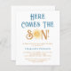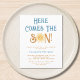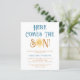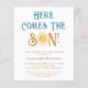 Convide a família e os amigos para o seu chá de fraldas temático com este belo convite de chá de fraldas dos rapazes. Apresenta o texto "Aqui Vem o Filho" em retrorreflectotipografia com uma cor amarela e gira-d'água. Facilmente personalizável. Original Watercolor © Michele Davies.