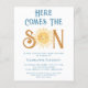 Convide a família e os amigos para o seu chá de fraldas temático com este belo convite de chá de fraldas dos rapazes. Apresenta o texto "Aqui Vem o Filho" em tipografia retrô azul com uma cor amarela e bonita. O dorso é decorado com um padrão de sol sorridente. Facilmente personalizável. Original Watercolor © Michele Davies.