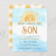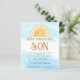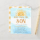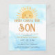 Convide a família e amigos para o seu chá de fraldas temático com este convite para chás de fraldas dos rapazes. Ele apresenta o texto "Aqui Vem o Filho" na tipografia na moda com um lindo sol amarelo de aquarela em um fundo azul-céu. O dorso é decorado com um padrão de sol sorridente. Facilmente personalizável. Original Watercolor © Michele Davies.