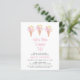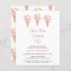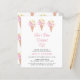 Este chá de panela com o tema do sorvete bonito é decorado com três cones e flores de sorvete de aquarela. O texto diz: "Ela foi enfiada!" na tipografia rosa-na moda. Você pode personalizar este cartão adicionando as informações do seu chá. Original Watercolor © Michele Davies.