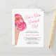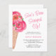 Este chá de panela orçamentário com tema de sorvete bonito é decorado com florais de aquarela e um cone de sorvete. O texto diz: "Ela foi enfiada!" na tipografia rosa-na moda. Personalize esta placa adicionando as informações do seu chá. Original Watercolor © Michele Davies.