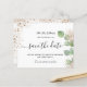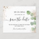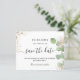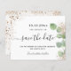 Um casamento de moda Salve a Data. Um fundo branco na moda, decorado com folhagem de eucalipto e pó de ouro falso. Personalize e adicione uma data, nomes e texto. . O texto: Salvar a Data é gravado com um script de estilo com letra de tendência grande com alternâncias.