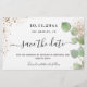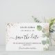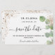 Um casamento de moda Salve a Data. Um fundo branco na moda, decorado com folhagem de eucalipto e pó de ouro falso. Personalize e adicione uma data, nomes e texto. . O texto: Salvar a Data é gravado com um script de estilo com letra de tendência grande com alternâncias.