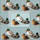 Este tecido do animal caracteriza um teste padrão de repetição de três patos do pato selvagem. Os homens têm as cabeças verdes iridescentes, os corpos brancos e os bicos amarelos. As penas da fêmea são marrons e ouro com um bico alaranjado. São tais pássaros de água bonito! Personalize facilmente a cor azul pálido do fundo a essa que serirá melhor seu projeto especial.