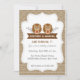 Convite de aniversário para crianças com um tema de ouriço giro e um fundo de madeira marrom.