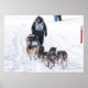 Uma foto de uma das equipes de trenó chegando depois de uma longa e nevada UP 200.